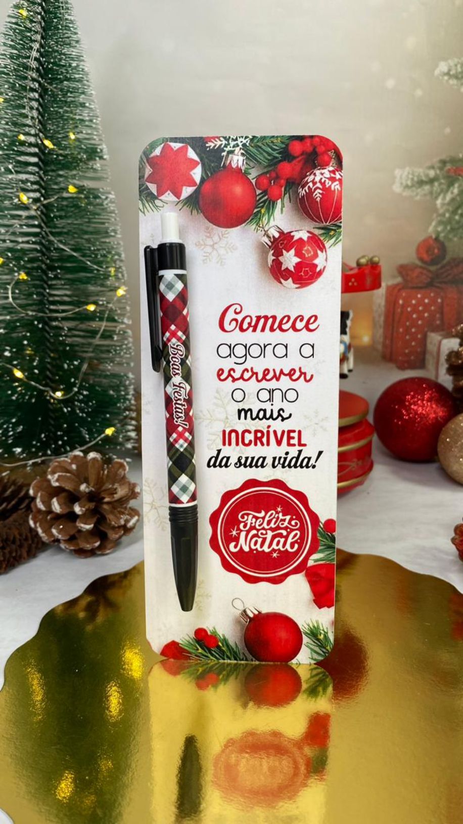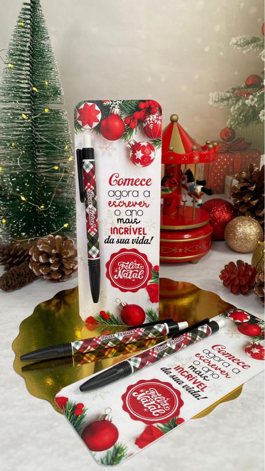 Surpreenda com criatividade e sofisticação neste Natal! Este cartão inclui espaço para acomodar uma caneta e a arte para personalizá-la com um adesivo exclusivo. Parte da Coleção de Natal! 🎁✨